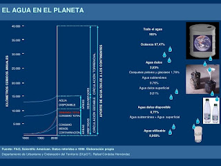 In Spain, where droughts are becoming increasingly frequent and virulentcontroversies over the supply and use of water is acute. Nobody seriously facing as vital factors in the shortage of water such as: climate change, lack of forests (Spain has lost more than 4 million hectares in the last decades), pollution of water (about 33,000 cubic hectometres water quality is fair, poor or low and can not be used), losses in the supply and pipes (about 20of piped water is lost to leakage) wastefulirrigation systems (installation of micro irrigation systems could be reduced by more than 40% - some 10,000 cubic hectometres - water use in agriculture), the excessive consumption of each one of us (after U.S., Russia and Canada are the fourth largest consumer country water in the worldwith 1,174 meters cubic per capita and year).